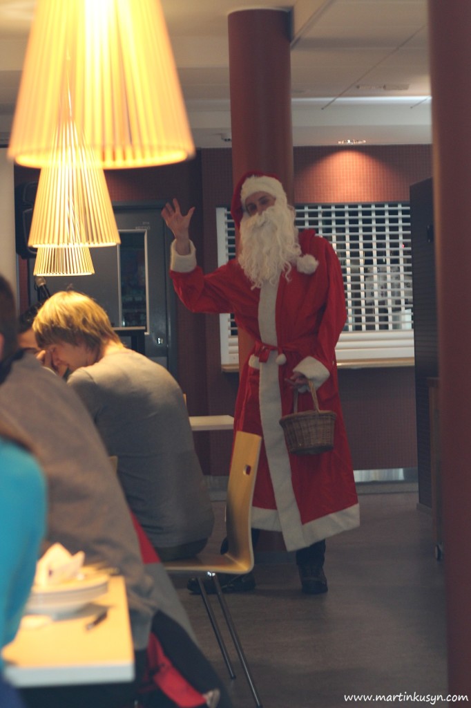 13.12.2012 23:44Deň 111. Celkom sranda, už sa mi približuje môj príchod domov. Už len pár dní a som doma, ale zatiaľ treba makať na prácach. Ale keď vstanem niečo po obede, času nie je veľa. A tak sa hrám so semestrálkou a snažím sa stihnúť čo najviac, lebo večer máme už program vybavený. Vianočná party spojená s našou rozlúčkou, keďže už len 7 dní sme študentami JAMK. Nechýbala klasická fínska vianočná večera, čo som bol dosť prekvapený, že Fíni majú na vianoce krupicu s kompotom, ale veľmi chutilo. Vyhrali sme v kvíze opasok na kufor, celkom sranda pokiaľ sme prišli na to, čo to je. Samozrejme nesmieme zabudnúť na Mikuláša, ktorý nám robil zábavu. Celkom fajn čas. Neskôr sme sa už pobrali späť na ubytovňu, kde som sa pustil do semestrálky a následne som sa spamätal až o 4:00 ráno, že bolo by dobré si aj oddýchnuť. A tak v podstate ráno zahajujem spánok.